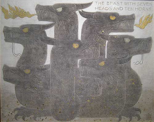押元一敏 黙示録の怪物 麻、薄美濃紙、墨、岩絵具、箔 F30 2008 |